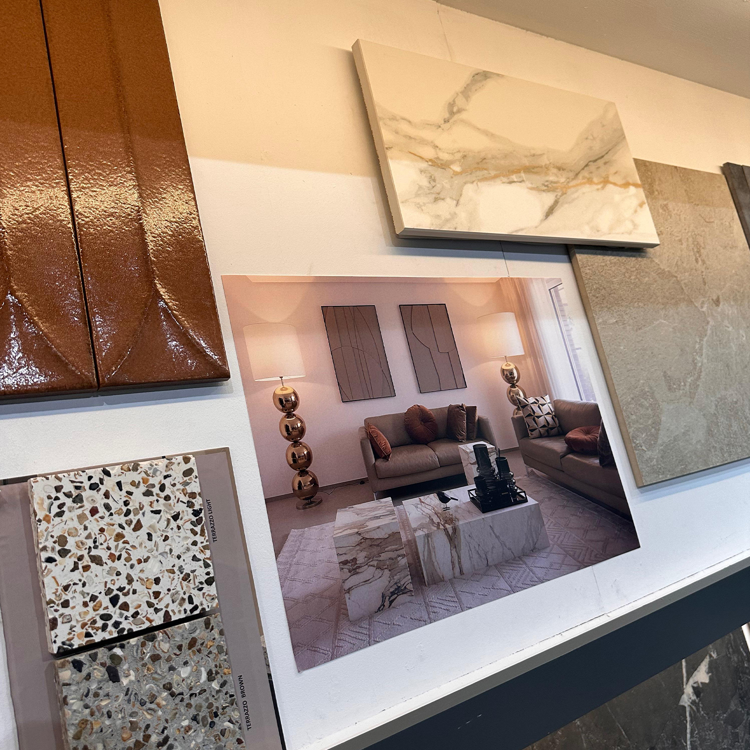 Binnen de studio is ook ruimte voor maatwerk. Verschillende elementen laten zien wat er mogelijk is wanneer materialen specifiek worden ontwikkeld en toegepast binnen een project. Aan de centrale designtafel kunnen collecties naast elkaar worden gelegd en gecombineerd. Dit maakt het mogelijk om kleuren, structuren en materialen zorgvuldig op elkaar af te stemmen en tot een samenhangend geheel te komen.